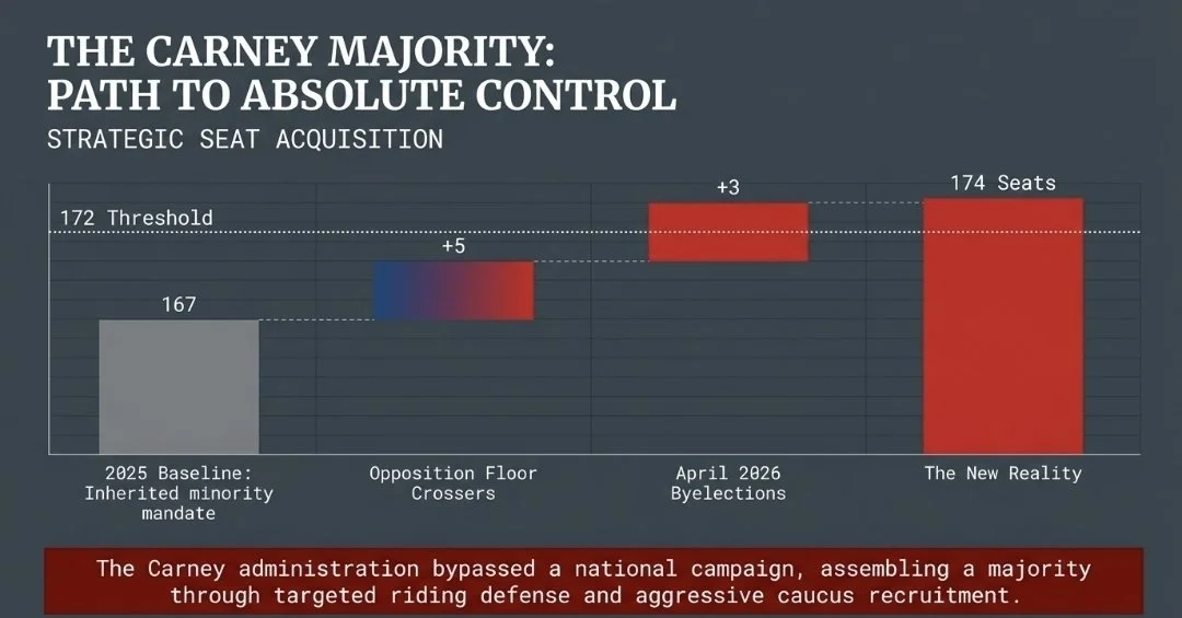 Through a cold, clinical series of byelection sweeps and the strategic absorption of five floor- crossers, Mr. Carney has successfully stitched together a parliamentary body that- on paper- is unstoppable. It is a Franken- Majority, a creature of political engineering brought to life not by a national concensus, but by the calculated use of the rules.